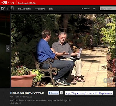 Everyone wants to see Gilad Shalit safe and well and back home but I think there is a real failure to understand the price that is being paid, and the price is phenomenal," said Arnold Roth, who lost his daughter Malki in the Jerusalem suicide bombing in 2001. "We are releasing people who have dedicated their lives to killing Jews and Israelis."The video clip of the interview is online here. The CNN site is sometimes unreliable so here's a home-made video we made of the CNN clip: