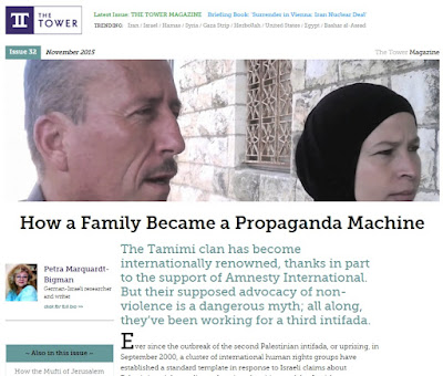 Under the title "How a Family Became a Propaganda Machine", she reveals how the Palestinian Arab Tamimi clan (about whose members we have written often) has become internationally renowned for their supposed advocacy of non-violence - in large measure due to to the indispensable support of Amnesty International.