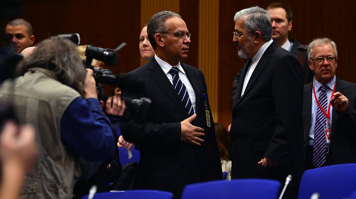 | From the IAEA website: Iran's Ali Asghar Soltaniyeh speaks with other delegates at yesterday's IAEA Board of Governors gathering in Vienna [Image Source] |